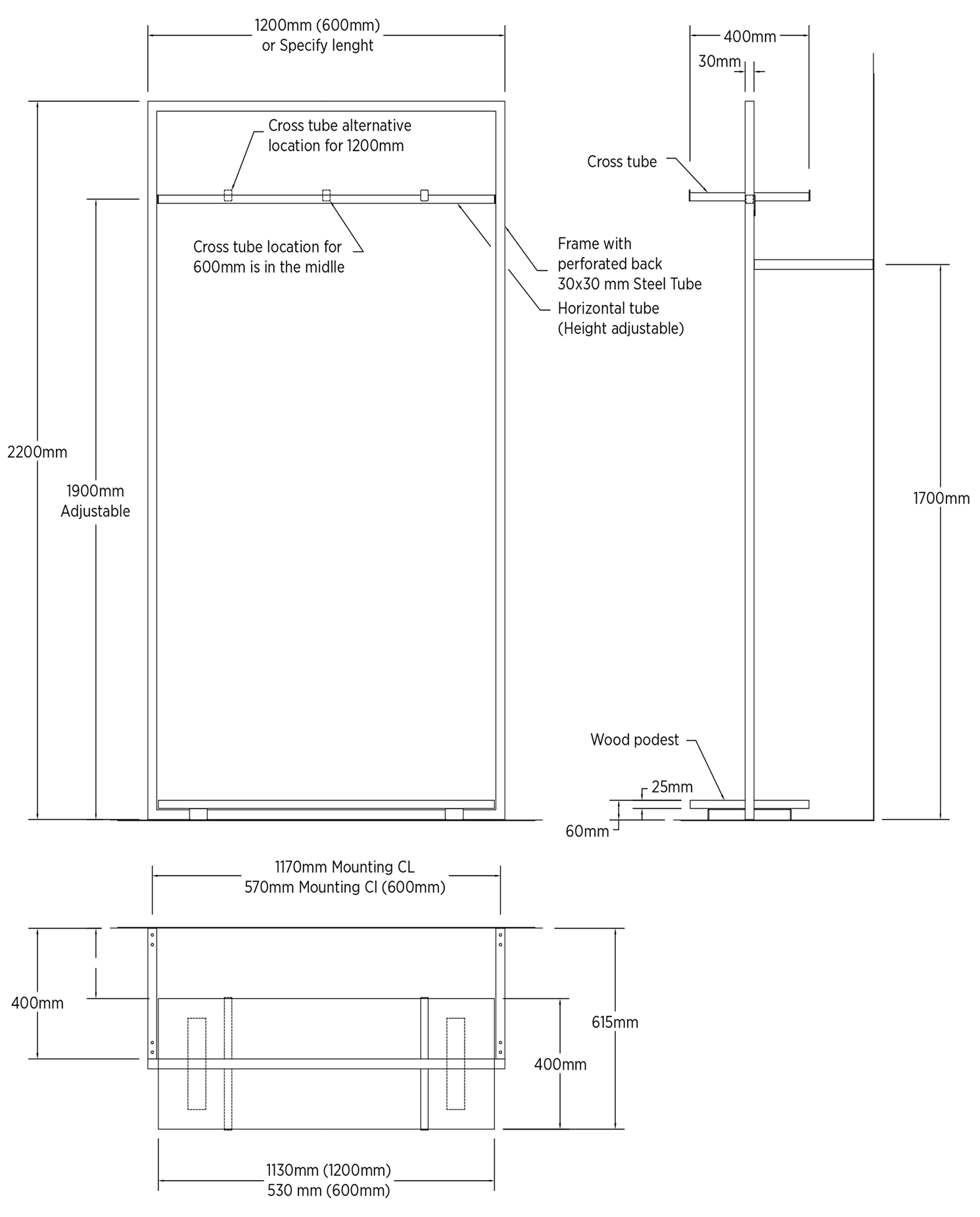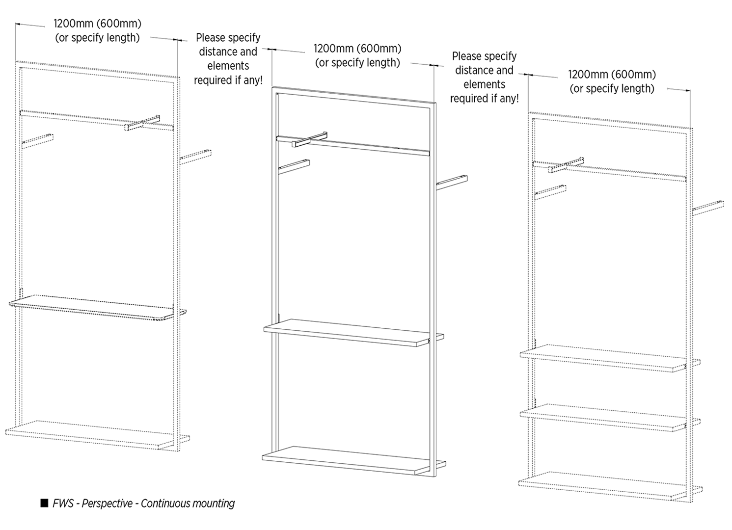The wall system is easily attached to the wall and with a large selection of hanging brackets, shelves for displaying clothes, shoes and other exhibition items. This type of system enables the subsequent easy movement of the elements by height.