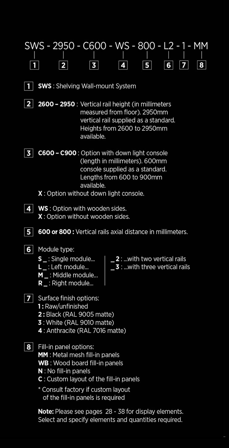 The wall system consists of a wall-mounted metal structure that is attached to the wall and a large selection of hanging brackets, shelves for displaying clothes, shoes and other exhibition items. This type of wall shelf system enables easy moving of the shelves later on in height.
